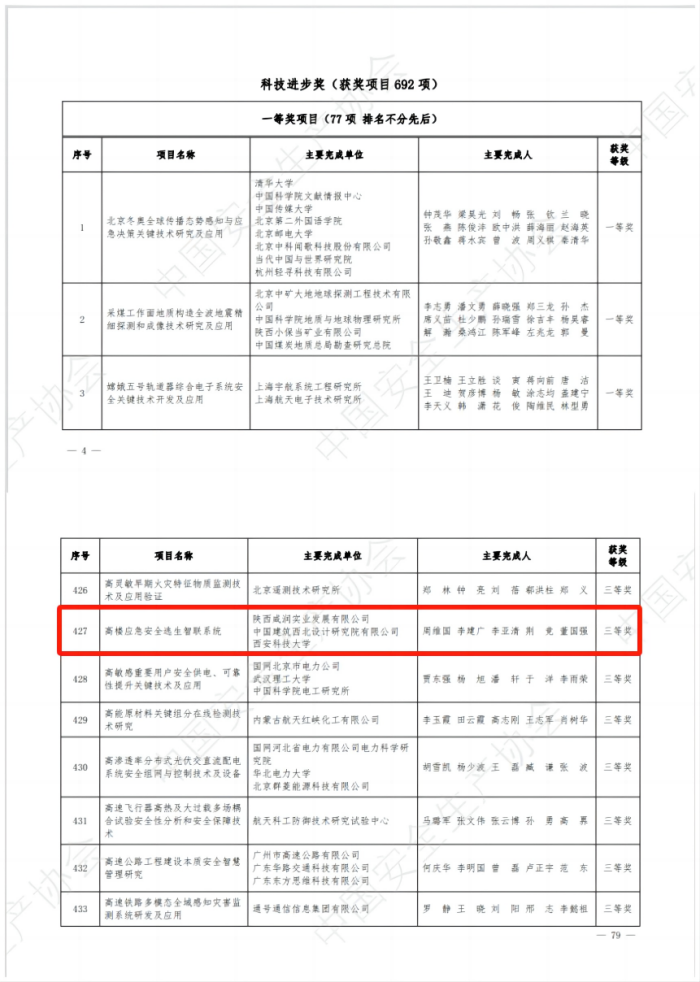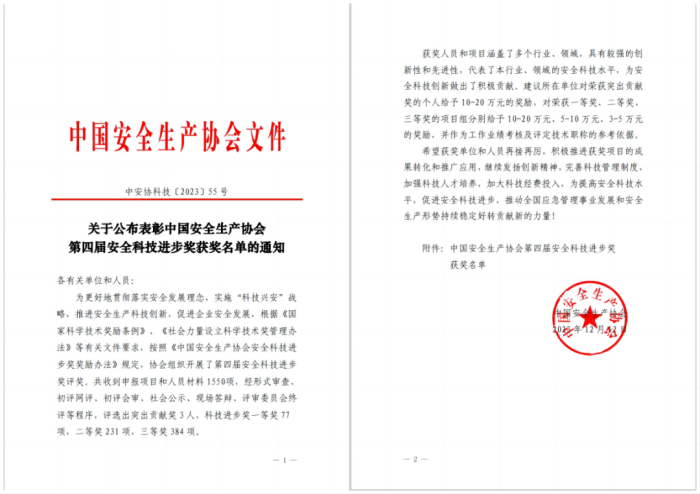 “中國安全生產(chǎn)協(xié)會第四屆安全科技進(jìn)步獎”!